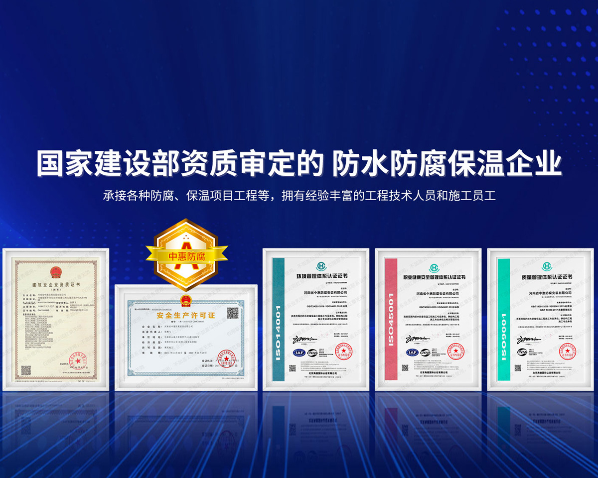 公司經營范圍:防水防腐保溫工程;消防設施工程;建筑裝修裝飾工程;建筑機電安裝工程;電力工程;建筑工程;石油化工工程;工業清洗工程;油罐清洗工程;鋼結構工程;環保工程;模板腳手架工程;電纜防火封堵、防污閃噴涂、外墻外保溫工程;各類施工勞務作業;設備維修、船舶鉚焊、涂裝;電力工程材料、建材、防水材料、防火材料、防腐保溫材料銷售,并相繼通過了GB/T19001-2008idtISO9001:2008GB/T50430-2007質量管理體系認證證書。GB/T24001-2004idtISO14001:2004環境管理體系認證證書。GB/T28001-2011idtOHSAS18001:2007職業健康安全管理體系認證證書。公司是中國防腐蝕于防護協會、中國施工企業管理協會、電力協會和中國鋼結構防水協會會員單位。 公司的經營業務涵蓋了石油、化工、電力、冶金、煤炭、船舶、國防、燃氣、水利、環保、交通運輸、航空及國防軍工和輕紡市政等行業的防腐保溫絕熱設備。鋼結構安裝、防火、防水、金屬噴鍍、聚脲噴繪、陰極保護、防滲透堵漏、玻璃鋼及各種磚版材料襯里、橡膠襯里、煙氣硫和耐酸溶劑腐蝕等工程施工。公司連續十年榮獲“省市先進施工企業”“安全生產先進單位”“重合同,守信用企業”和“AA***資質企業”的稱號。2000年被命名為市級文明單位,2002年被國家工商行政管理局命名為“重合同,守信用的企業”、被中國工業防腐蝕技術協會命名為“防腐蝕企業,能源節約及環境保護領域有豐富的經驗和***的業績。工程一次交驗合格率100%。其中攀枝花鋼鐵公司煉鐵廠四號高爐及熱風爐防腐工程、上海寶鋼公司煤氣柜防腐工程、撫順石油一廠裝置防腐項目、齊魯石化公司稀烴廠高塔防腐工程、吉林化學工業公司煉油廠油罐防腐工程、天津石化熱電廠六號爐頂棚聯絡管保溫工程、大慶油田(太倉)力神泵業工程、中國化學工程第十一建設工程、中原油田勘探局工程、中國石化銷售有限公司華北分部、魯皖輸油管道工程、貴州開磷息烽合成氨工程、陜西黃陵煤化工程、中國石油天然氣西部管道塔里木輸油工程、邯鋼集團邯寶鋼鐵公司煉鐵工程、德州供電工程、吉寶(南通)船廠工程,偃師華潤熱力工程、鄭州熱力總公司。 河南省中惠防腐安裝有限公司愿以豐富的施工經驗,***的技術,***的設備,***的管理,***的服務,竭誠為國內外廣大的用戶提供***滿意、******的工程作品。 我公司愿與國內外同仁一道,團結協作,共同推進防腐蝕行業發展! 公司地址:河南省長垣縣建設路北段360號 固定電話:0373-8866488 郵編:453400 網址:http://www_zhff_com_cn.xujiabaowen.com